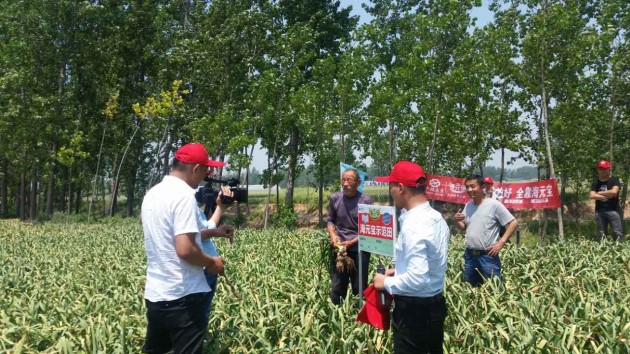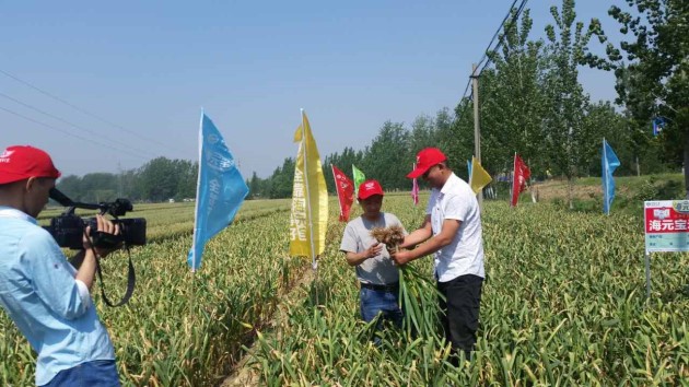 5月18日,中農(nóng)控股產(chǎn)品研發(fā)營銷中心一部的山東省區(qū)經(jīng)理陳冬燁、區(qū)域經(jīng)理陳登建、百優(yōu)農(nóng)資公司全體員工、當(dāng)?shù)乜h各鄉(xiāng)鎮(zhèn)合作伙伴、種植大戶、當(dāng)?shù)仉娨暸_記者組成“海元寶”大蒜觀摩團(tuán),一起走訪了金鄉(xiāng)縣羊山村等周邊5個村的“海元寶”大蒜示范田,見證了海元寶肥料的神奇肥效。