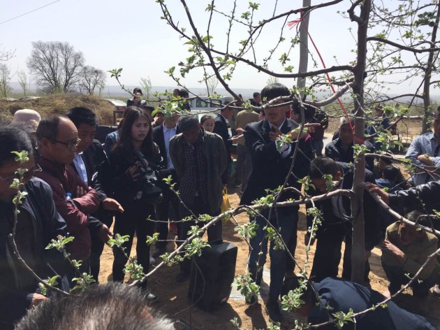 ??? 觀摩會現場,中國農業大學在陜西洛川科技小院的研究生為近140位果農講解了水肥一體化技術并進行演示。省時省工的水肥一體化技術一下子就吸引了果農的眼光,大家紛紛對滴灌設備的構造和原理、液體肥的使用等進行了詳細的詢問。