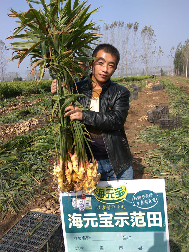 ? ? 據“海元寶”農化服務人員介紹,示范田種植戶牛大江種植了6畝大姜,其中1畝用普通復合肥作為對照,其他5畝全程用“海元寶”大姜高產套餐施肥方案。示范田底肥用“海元寶”復合肥(15-10-15)100公斤、生物有機肥80公斤加中量元素有機肥80公斤。