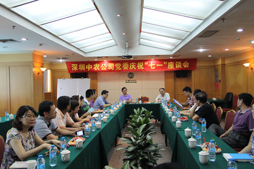 ? ? ? 7月1日,深圳市中農生產資料有限公司(簡稱“深圳中農”)黨委在深圳中農大廈舉行座談會,紀念中國共產黨誕辰92周年。來自深圳中農本部、各控股公司支部的黨員30余人參加座談。座談會由深圳中農黨委委員、黨辦主任馬立鶴主持。?????座談會上,深圳中農董事長兼總經理肖建國與大家共同回顧了深圳中農從黨支部組建、擴大到黨總支成立20年來的發展歷程。在談到公司黨建工作時,肖建國說,目前深圳中農面臨著內外部的挑戰和改革發展的壓力,黨組織的政治優勢要向競爭優勢和發展優勢的方向轉化,不管公司管理模式發生何種變化,作為一名共產黨員,都應該保持堅定的政治信念,堅持黨性原則,保持共產黨員先進性,在日常生活中以黨員的標準嚴格要求自己。?????隨后,公司黨委、紀委成員和各支部黨員代表暢所欲言、各抒己見,分別結合各自的入黨經歷、學習、工作和生活實踐,暢談了在黨建工作中的經驗和體會,抒發了立足本職崗位,發揮共產黨員先鋒模范作用的感想,并結合業務發展提出了諸多積極建議。來自駐深農資企業的退休黨員陳永蓮在發言中對深圳中農黨委給予的關懷表示感謝,黨委開展的有聲有色的黨建活動讓他們充分體會到了黨組織的歸屬感和榮譽感。????最后,肖建國希望各黨支部要充分發揮組織領導作用,各黨員更要以身作則,在公司轉型之際,同舟共濟、齊心協力,發揮戰斗堡壘和模范作用,將每個黨員、每個員工的夢匯聚成深圳中農的夢,更好地推動深圳中農不斷發展。