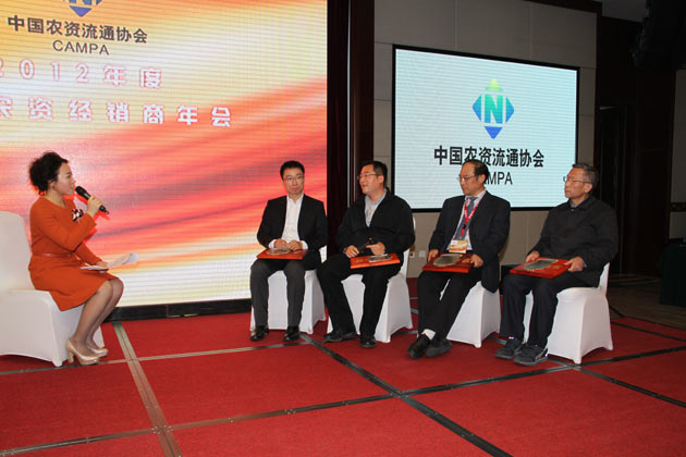 ? ??11月18日,中國(guó)農(nóng)業(yè)生產(chǎn)資料流通協(xié)會(huì)“2012年中國(guó)農(nóng)資經(jīng)銷商年會(huì)”在北京召開(kāi)。來(lái)自國(guó)家發(fā)展和改革委員會(huì)、科技部、工業(yè)和信息化部、財(cái)政部、農(nóng)業(yè)部、商務(wù)部、國(guó)家工商行政管理總局、中國(guó)科學(xué)院、中國(guó)物聯(lián)網(wǎng)發(fā)展研究中心、中國(guó)石油和化學(xué)工業(yè)聯(lián)合會(huì)、中國(guó)商業(yè)聯(lián)合會(huì)、中國(guó)市場(chǎng)學(xué)會(huì)、人民日?qǐng)?bào)社、中央電視臺(tái)農(nóng)業(yè)頻道、光明日?qǐng)?bào)社、農(nóng)民日?qǐng)?bào)社、中華合作時(shí)報(bào)社以及供銷總社下屬13家社團(tuán)組織等單位的嘉賓和全國(guó)各地的會(huì)議代表約400余人參加了此次會(huì)議。總社理事會(huì)副主任、中國(guó)農(nóng)業(yè)生產(chǎn)資料流通協(xié)會(huì)會(huì)長(zhǎng)、中國(guó)供銷集團(tuán)董事長(zhǎng)顧國(guó)新出席大會(huì)并致辭。中農(nóng)集團(tuán)董事長(zhǎng)、黨委書(shū)記肖仲凱,集團(tuán)黨委副書(shū)記李憲賓,集團(tuán)董事、中農(nóng)控股總經(jīng)理羅德強(qiáng)等作為受邀嘉賓出席了大會(huì)。